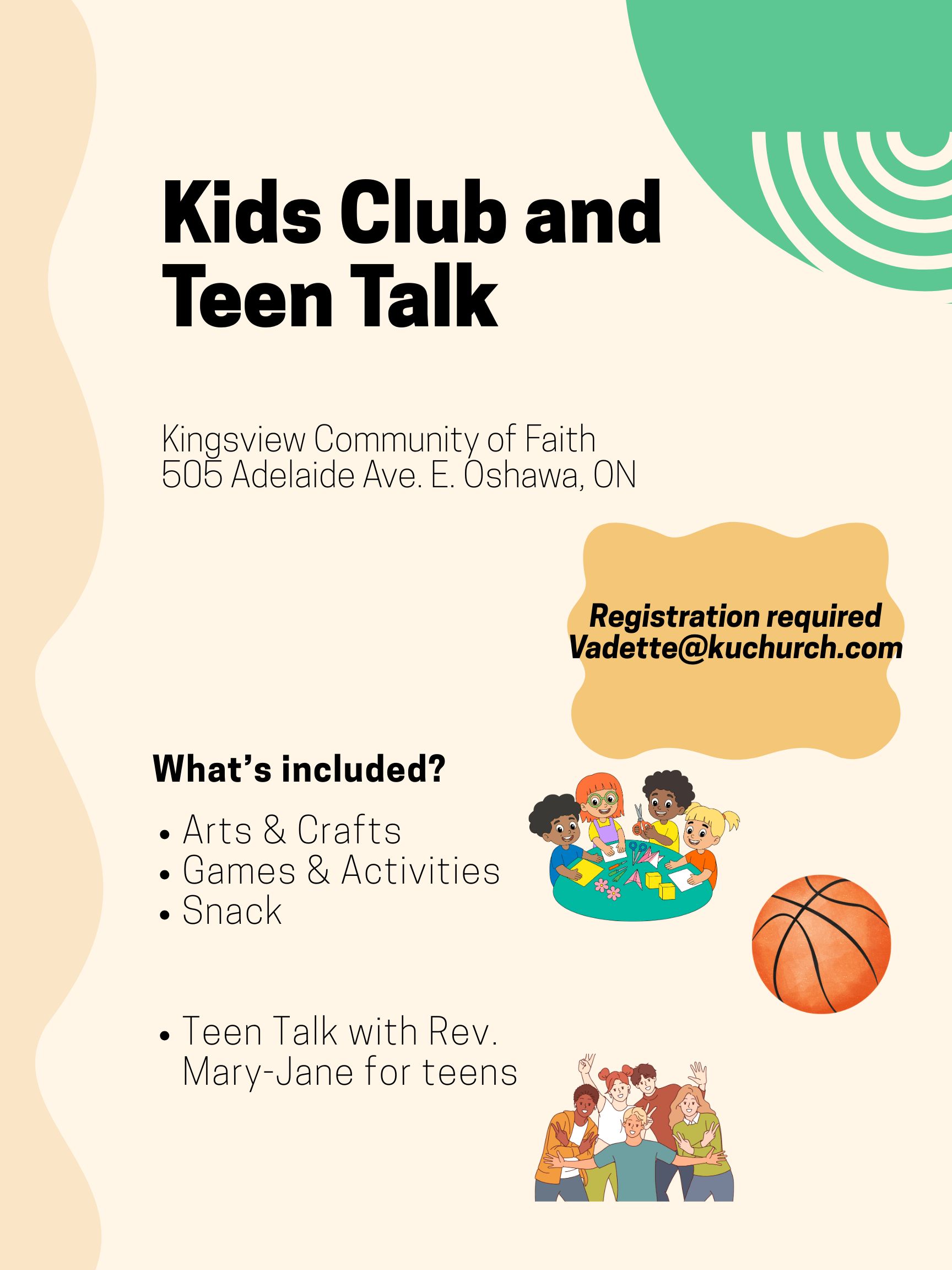 Children ages 4 to 12 years of age, come and play games, sports, crafts and enjoy a snack. Older Youth will have chat time with Rev. Mary-Jane. Pre-register by email to Vadette@kuchurch.com. All are welcome!